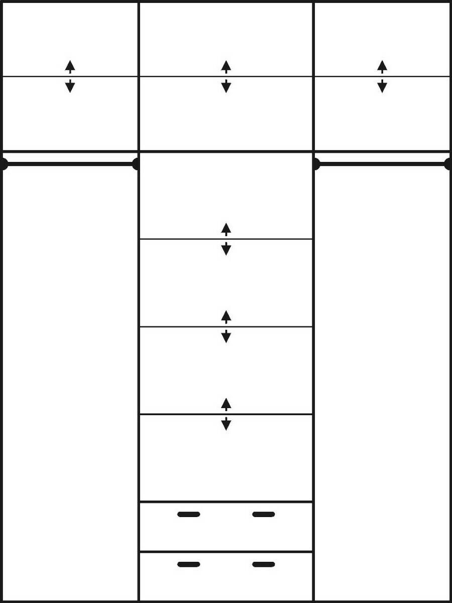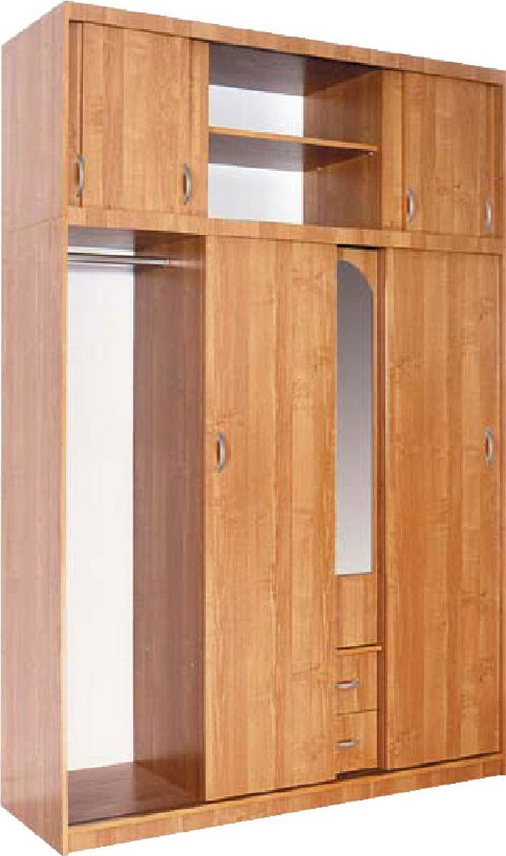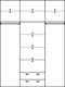 ZobrazitŠatní skříň s posuvnými dveřmi. Pravý a levý díl je vybaven věšákovou tyčí, střední díl je vybaven policemi a na posuvných dveřích se nacházejí 2 zrcadla. Na spodku středního dílu se nacházejí 2 zásuvky. Horní díl je vybaven 4 posuvnými dvířky a uvnitř je vybaven policemi. Šedé oválné úchyty. Provedení olše a buk.