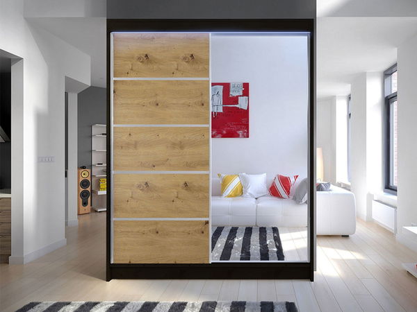 ZobrazitVíce informací Hledáte moderní posuvný šatník pro svůj domov? Máme pro vás skvělou nabídku! Posuvná skříň Bianca je model dostupný v široké škále barev a zajímavých kombinací. Bianca šatní skříň má dvě posuvná křídla, z nichž jedna má vodorovně uspořádané ozdobné lišty. Druhé posuvné křídlo má ovšem velké zrcadlo, což je velmi praktické řešení pro skříně. Posuvné dveře můžete otevřít pomocí hliníkové rukojeti. Interiér šatníku nabízí praktická řešení ve formě prostorných polic a tyče na ramínka. V další možnosti však můžete použít osvětlení RGB LED.