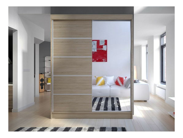 ZobrazitVíce informací Hledáte moderní posuvný šatník pro svůj domov? Máme pro vás skvělou nabídku! Posuvná skříň Bianca je model dostupný v široké škále barev a zajímavých kombinací. Bianca šatní skříň má dvě posuvná křídla, z nichž jedna má vodorovně uspořádané ozdobné lišty. Druhé posuvné křídlo má ovšem velké zrcadlo, což je velmi praktické řešení pro skříně. Posuvné dveře můžete otevřít pomocí hliníkové rukojeti. Interiér šatníku nabízí praktická řešení ve formě prostorných polic a tyče na ramínka. V další možnosti však můžete použít osvětlení RGB LED.