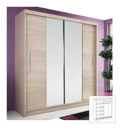 Pěkná a prostorná šatní skříň se hodí zejména do ložnic, destských pokojů, nebo předsíní. Skříň disponuje dvěma posuvnými dveřmi se dvěma zrcadly. V pravé straně skříně se nachází věšáková tyč a nad ní jedna polička. Za dveřmi na pravé straně má skříň pět poliček.