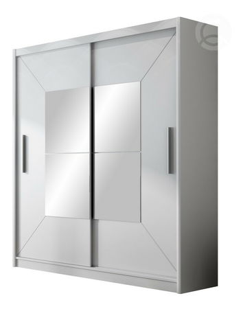 Šatní skříň s posuvnými dveřmi v moderním provedení. Korpus i dvířka jsou z kvalitního LTD a barevné provedení je bílá. Dveře obsahují praktické zrcadlo. Uspořádání polic viz. perokresba. Dodáváme v demontovaném stavu.