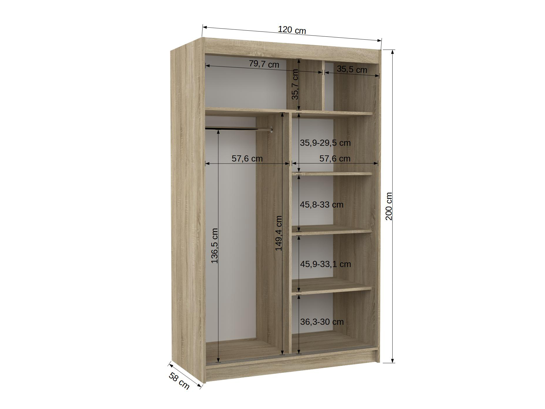 Tato šatní skříň od značky Botres s bílým a dubovým sonoma povrchem je ideálním doplňkem pro každou ložnici. S výškou 200 cm, šířkou 120 cm a hloubkou 58 cm poskytuje dostatek prostoru pro uskladnění vašich oblíbených kousků. Skříň je vybavena širokými dvířky, které se snadno otevírají a zavírají, a vnitřními poličkami a závěsnými tyčemi pro oblečení. Je vyrobena z kvalitních materiálů a její moderní design se hodí do jakéhokoli interiéru. S touto šatní skříní od Botres získáte praktický a elegantní úložný prostor pro vaše šaty a doplňky.
