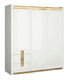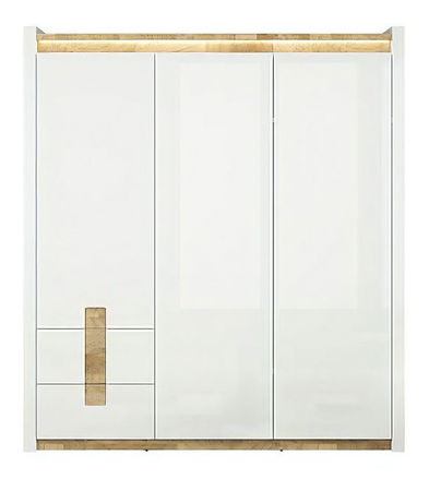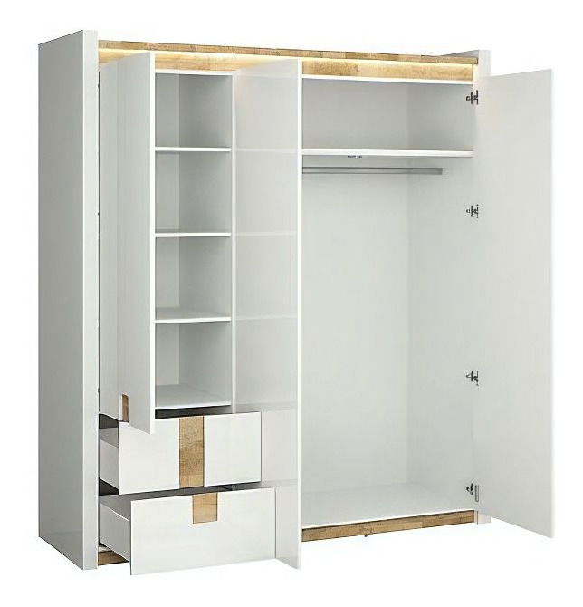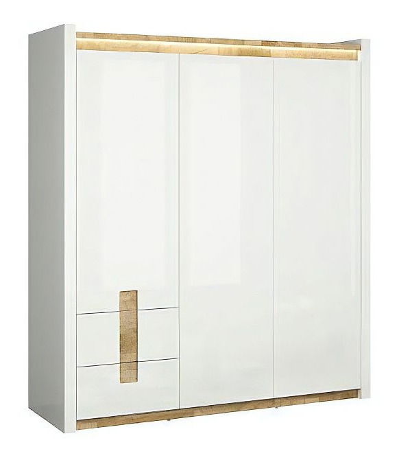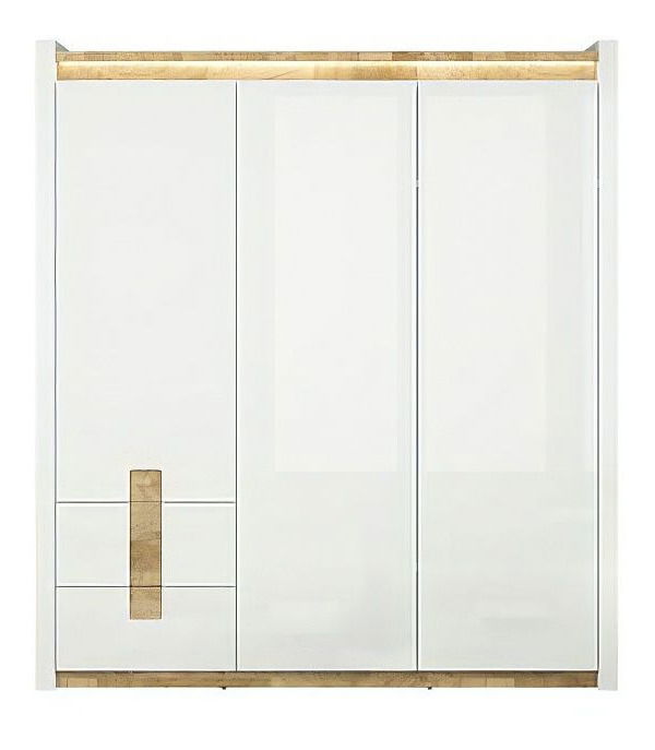 Třídveřová šatní skříň nabízí velký úložný prostor. Je předělena na dvě části a v pravé části se nachází jedna závěsná tyč a jedna police. V levé části se najdete vnitřní skříňku se třemi policemi a dvěma praktickými zásuvkami. Barvy dekoru dubu westminster a bílého lesku v kombinaci s moderními tvary skříně působí luxusním a čistým dojmem. Materiál: Nábytková deska. Nábytek disponuje bezúchytové otevíráním dvířek a při objednat si můžete LED osvětlení.