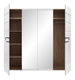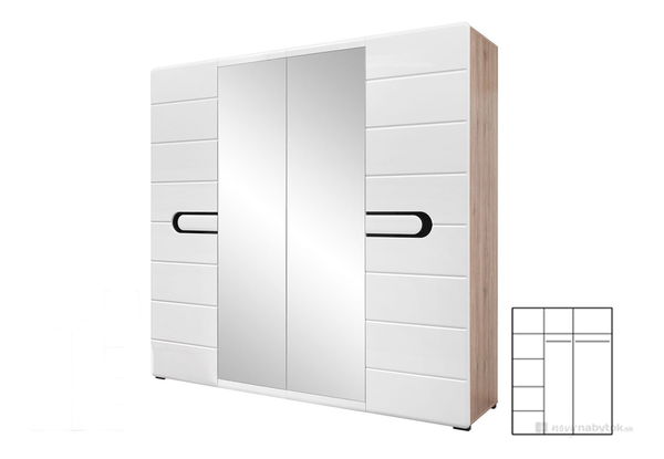 Zařiďte si ložnici v moderním stylu s prostornou šatní skříní Byron. Velká skříň poskytuje dostatek úložného prostoru. V její pravé straně najdete police i prostor na věšáky a na levé straně se nachází věšáková tyč a horní police. Středové přední části dominuje velké zrcadlo.
