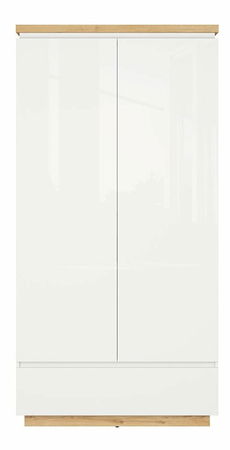Dvoudveřová šatní skříň je rozdělena příčkou na 2 části. Každá část obsahuje 1 závěsnou tyč. Možné dokoupit doplňkové police (3ks). Dole se nachází 1 prostorná zásuvka. Vrchní deska je potažená laminátem pro zvýšenou odolnost proti poškození.