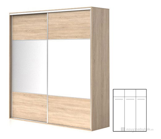 Širší šatní skříň s posuvnými dveřmi, která vám poskytne potřebný úložný prostor pro vaše oblečení a doplňky. Skříň má moderní design, pěkné barevné provedení a středový pás se zrcadlem.