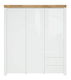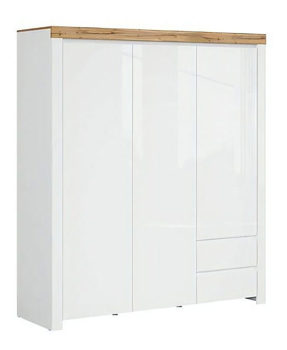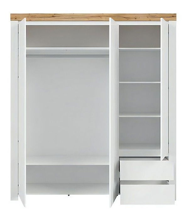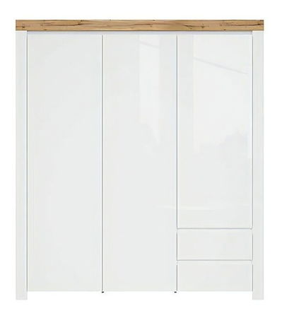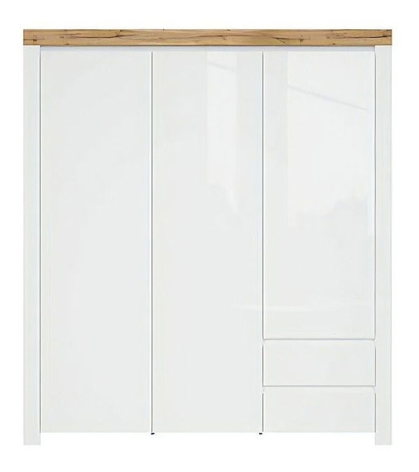 Velká šatní skříň je rozdělena na dvě části. Dvoudveřová část disponuje jednou vrchní, jednou spodní policí a jednou závěsnou tyčí. V jednodveřové části se nacházejí tři police a dole jsou dvě zásuvky s tichým uzavírajícím systémem. Tato skříň je jedinečná svými geometrickými tvary a přitažlivým barevným provedením. Bílý lest spolu s přírodním dekorem dubu Wotan dělají tuto skříň elegantní, moderní a nádherně prosvětlující Váš interiér. Materiál: Nábytková deska. Nábytek disponuje bezúchytové otevíráním dvířek a a systémem s tichým zavíráním dvířek.