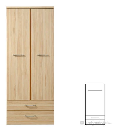 Šatní skříň jednoduchého designu vhodná na zařízení studentských nebo dětských pokojů. Má dvoje dvířka a dvě zásuvky ve spodní části. Do skříně si umístěte oblečení a různé doplňky. Zajímavé jsou kovové úchyty na dvířkách a zásuvkách.