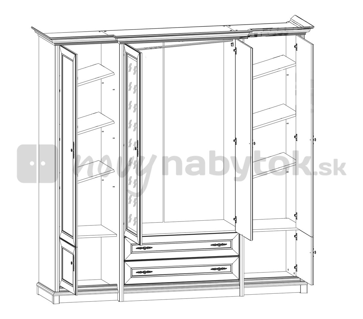 ZobrazitProstorná šatní skříň, která vám poskytne dostatečný prostor pro vaše oblečení a doplňky. Výjimečný archaický styl skříně a zejména ozdobné prvky zkrášlí vaše ložnice nebo obývací pokoje a dodají jim vkus. Prostřední dvířka na skříni mají zrcadlo. Ve spodní části skříně se nacházejí menší dvířka a dvě zásuvky. Dvířka a zásuvky mají ozdobné kované úchyty.