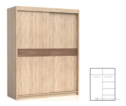 Moderní dvoudveřová šatní skříň s posuvnými dveřmi nabízí dostatek úložného prostoru pro Vaše oblečení. Pod horní poličkou se nachází věšáková tyč. V šatní skříni se nenacházejí police. V případě potřeby je možné si je přiobjednat.