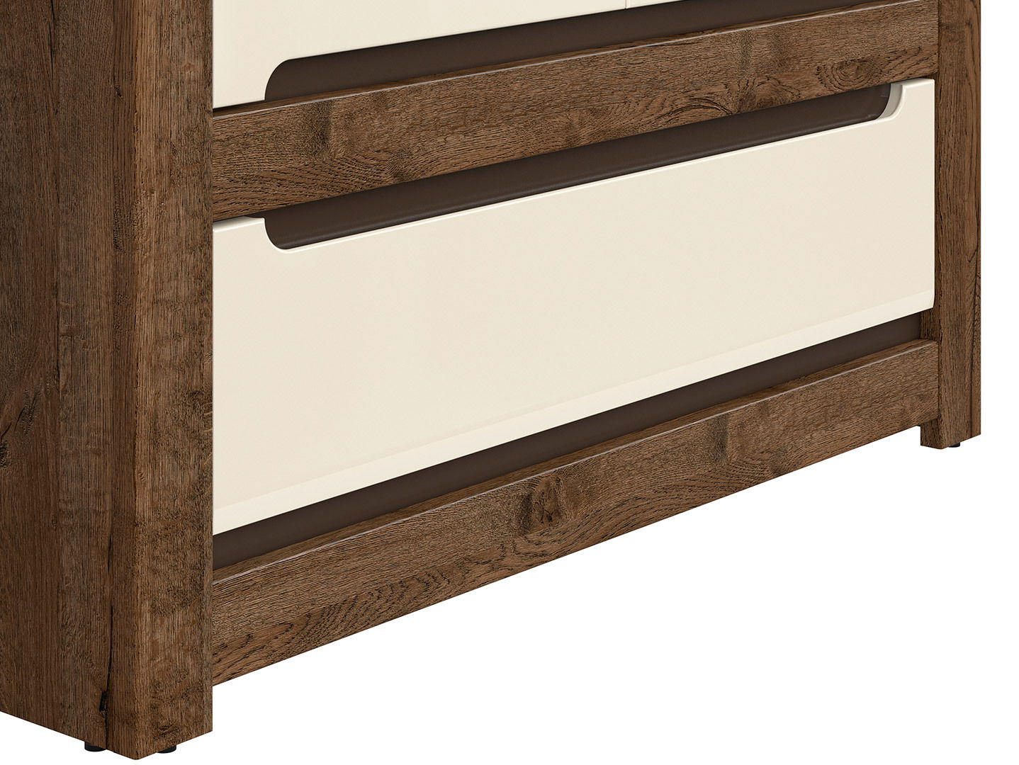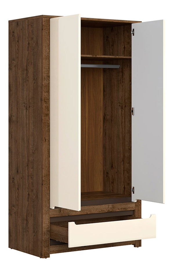 Pokud hledáte prostorný blok, který bude pracovat při skladování oděvů a příslušenství, podívejte se na šatník Ruso. Vybavená horní policí a závěsnou tyčí na usnadnění organizace oblečení. Prostorná zásuvka ve spodní části nábytku je místem pro osobní údaje. Dvoudveřová skříň je vybavena příslušenstvím s tichými malými dveřmi, které zvyšují komfort používání nábytku.