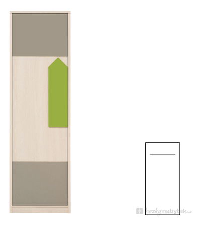 Moderní šatní skříň SZF1D_20_6 série Strzalka je velmi vhodná do dětského pokoje. Díky svým rozměrům Vám poskytne dostatek úložného prostoru pro Vaše bundy nebo kabáty. Zajímavé barevné provedení dubového dřeva a šedé barvy v kombinaci se zelenými doplňky korespondují s provedením celé série. Skříň je vyrobena z kvalitních materiálů.