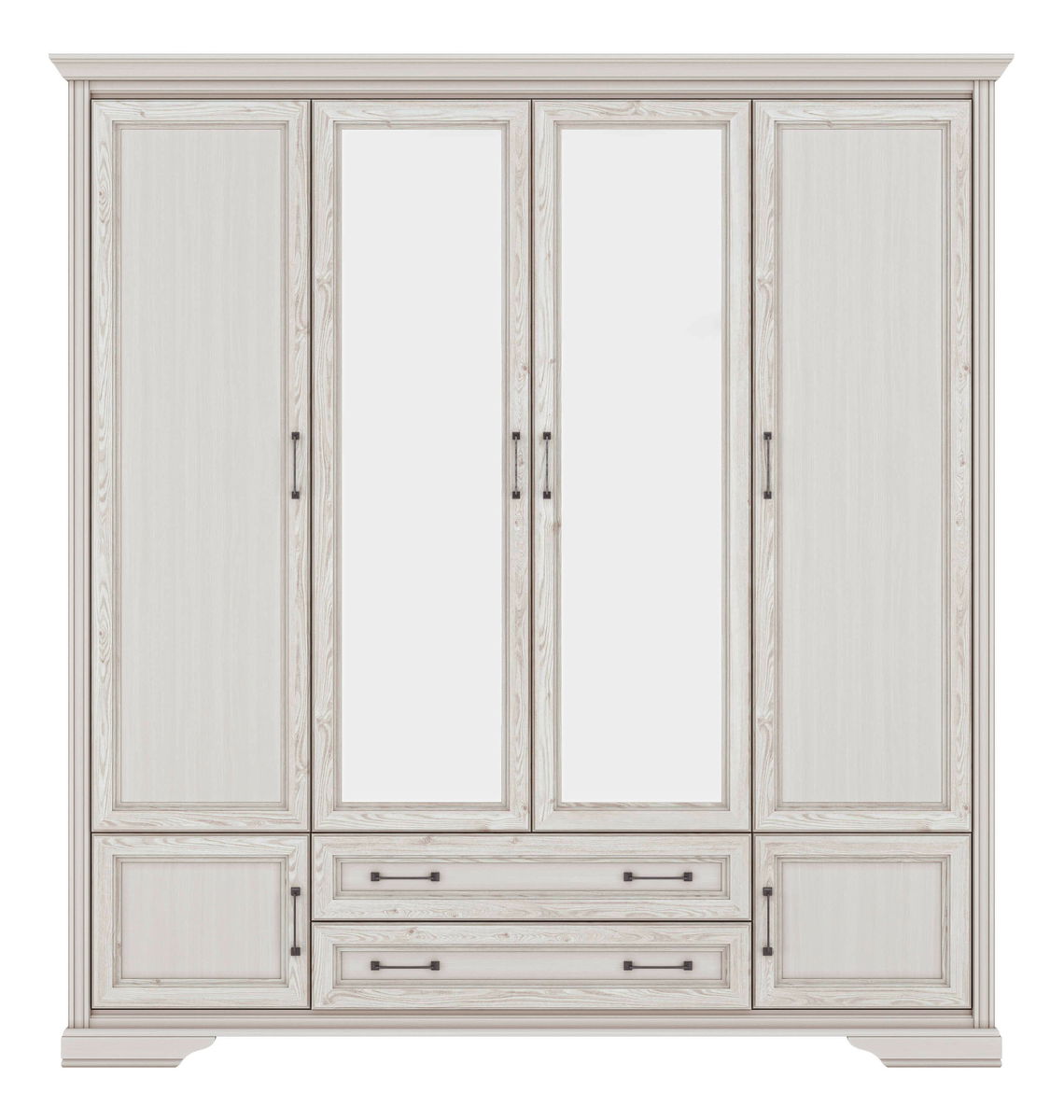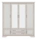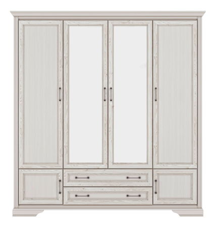 ZobrazitKrásná šatní skříň na odkládání oblečení a doplňků, která se hodí do ložnice a poskytne vám opravdu velké množství úložného prostoru. Za bočními velkými dveřmi se nacházejí police pro vaše oblečení. Prostřední dvířka se zrcadlem ukrývají jednu vrchní polici a jednu závěsnou tyč na kabáty a vesty. Ve spodní části se nacházejí dvě malé skříňky a dvě praktické zásuvky, které využijete na ponožky a spodní prádlo. Dvířka a zásuvky mají úzké černé úchyty.