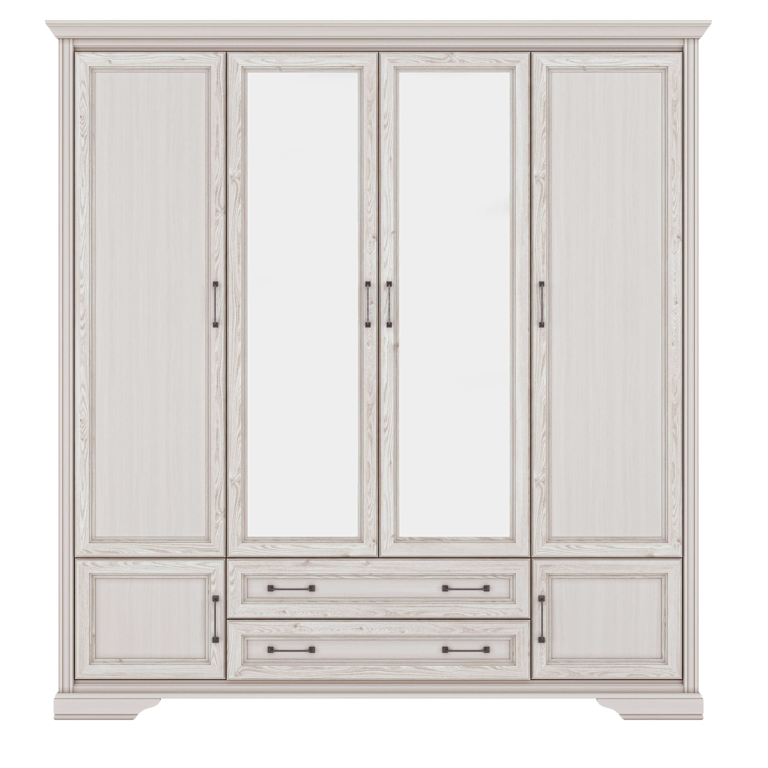 Krásná šatní skříň na odkládání oblečení a doplňků, která se hodí do ložnice a poskytne vám opravdu velké množství úložného prostoru. Za bočními velkými dveřmi se nacházejí police pro vaše oblečení. Prostřední dvířka se zrcadlem ukrývají jednu vrchní polici a jednu závěsnou tyč na kabáty a vesty. Ve spodní části se nacházejí dvě malé skříňky a dvě praktické zásuvky, které využijete na ponožky a spodní prádlo. Dvířka a zásuvky mají úzké černé úchyty.