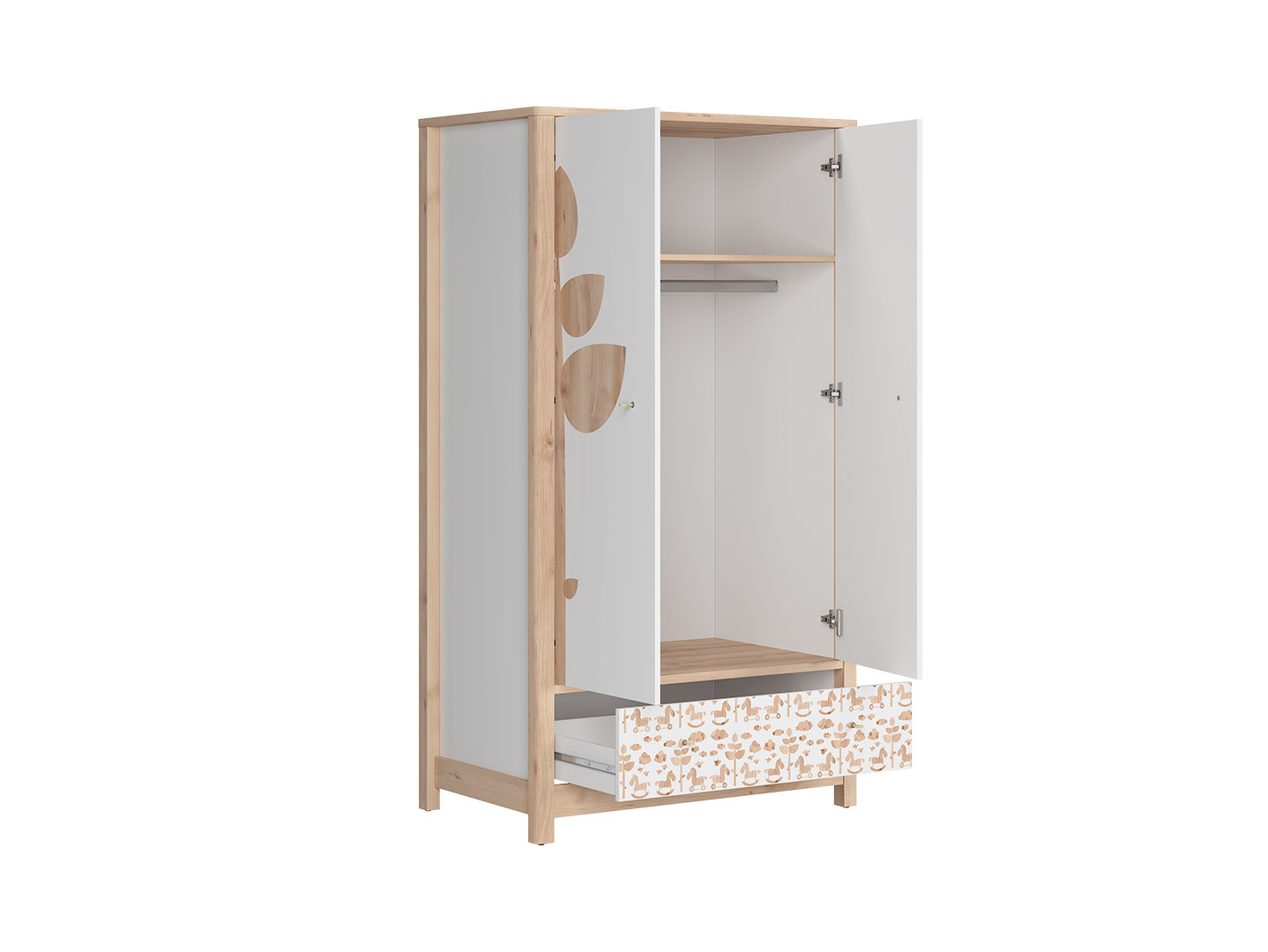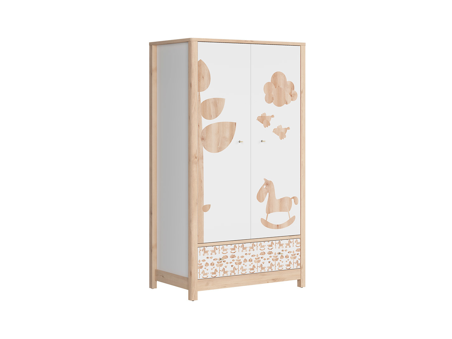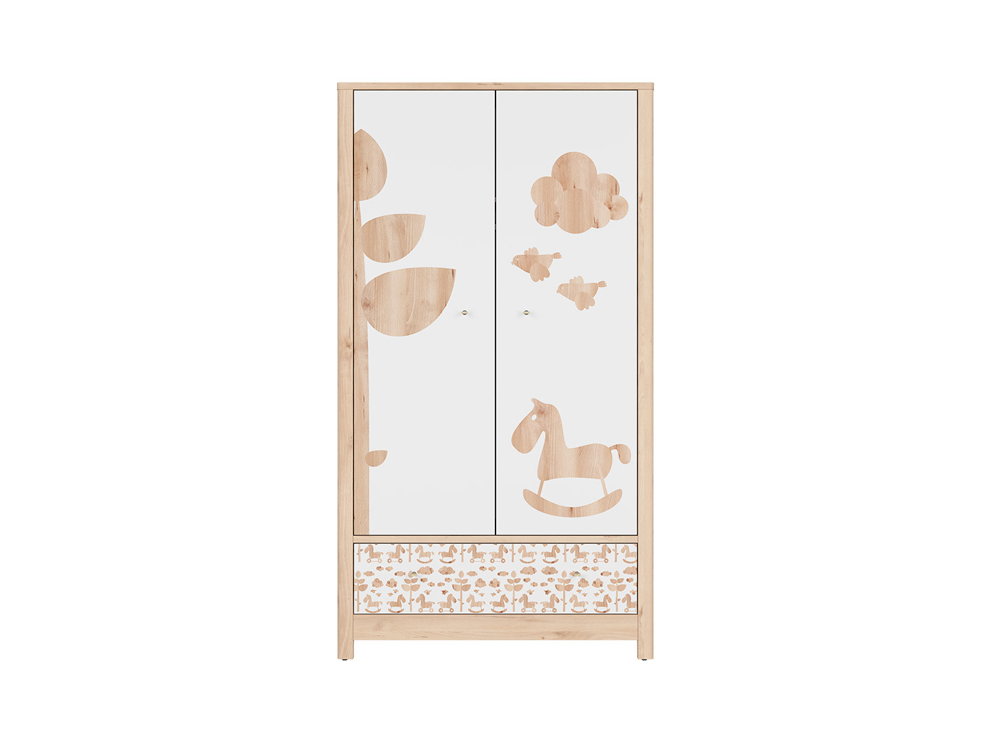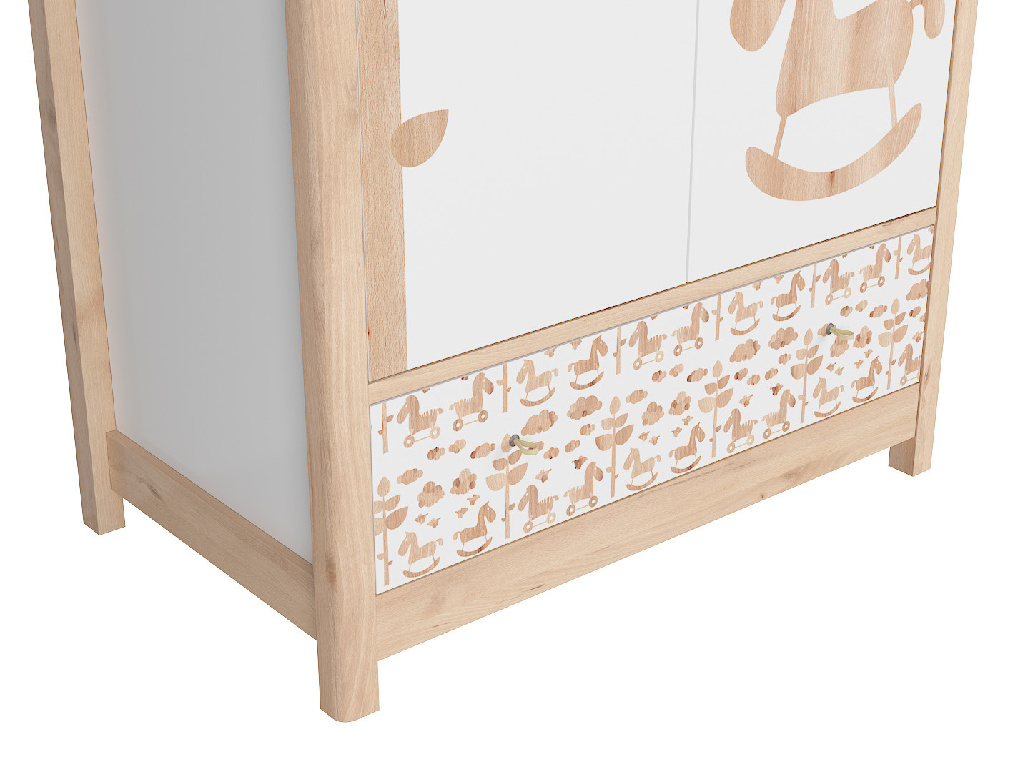 Krásná a prostorná skříň z kolekce Timon s potiskem koní. Dvoudveřová skříň obsahuje 1 polici, 1 závěsnou tyč a úložný prostor ve spodní části v podobě 1 zásuvky. Kožené úchytky představuje bezpečnou formu manipulace se zásuvkou. Kolekce Timon díky prvkům příjemné kombinace teplého dřeva a bílé barvy nabízí pohodlnou atmosféru pro nejmenší členy rodiny.