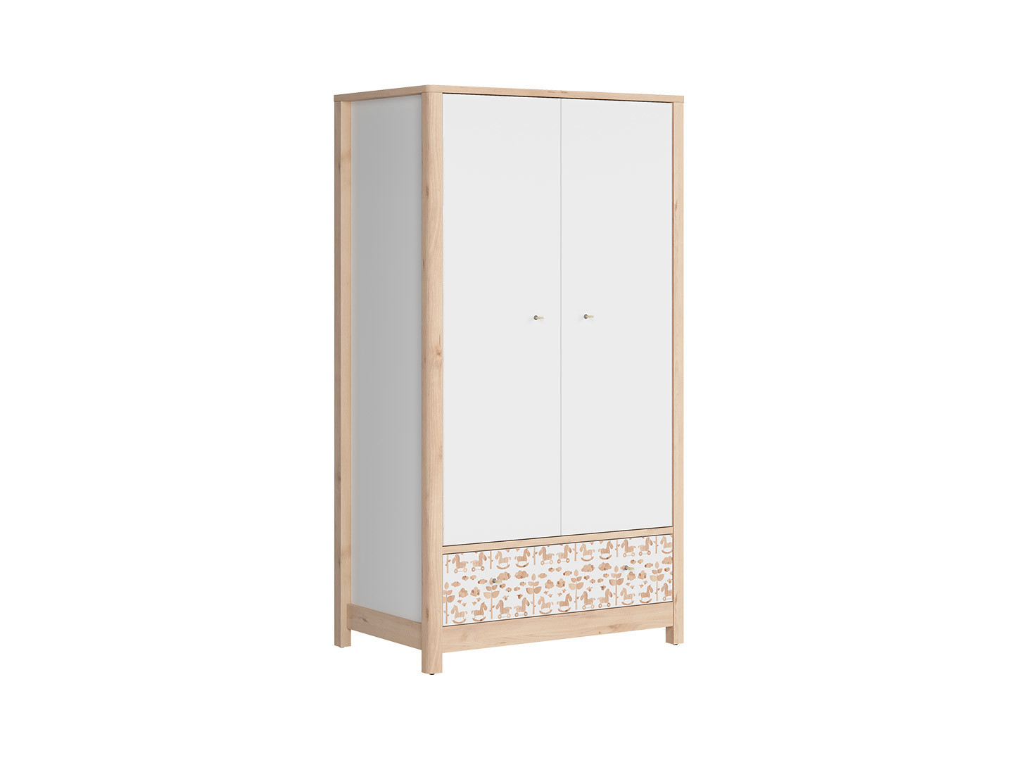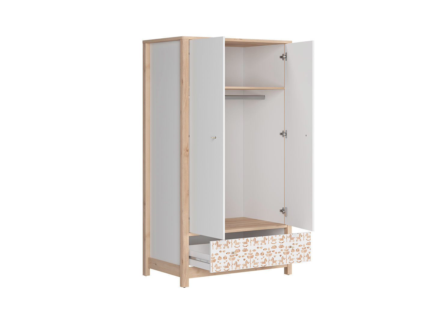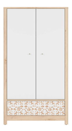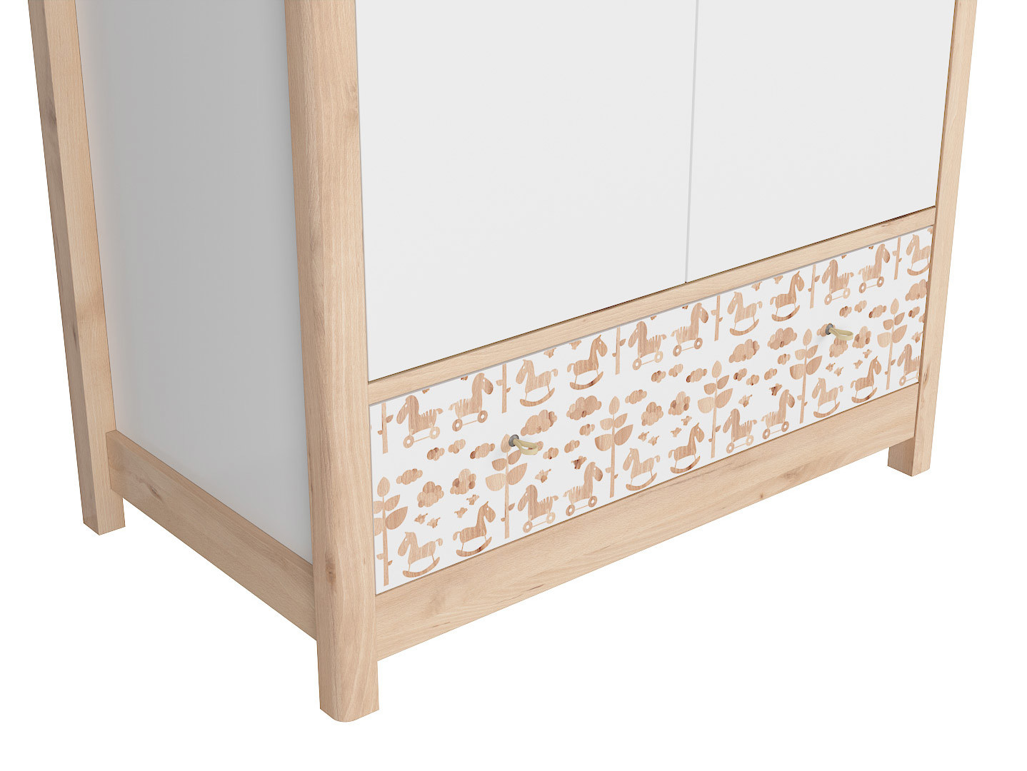 Prostorná skříň z kolekce Timon s potiskem koní. Dvoudveřová skříň obsahuje 1 polici, 1 závěsnou tyč a úložný prostor ve spodní části v podobě 1 zásuvky. Kožené úchytky představuje bezpečnou formu manipulace se zásuvkou. Kolekce Timon díky prvkům příjemné kombinace teplého dřeva a bílé barvy nabízí pohodlnou atmosféru pro nejmenší členy rodiny.