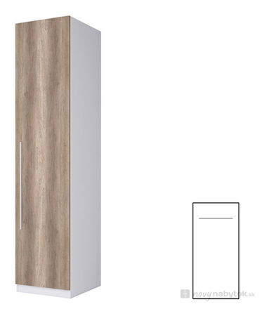 Úzká a vysoká šatní skříň vhodná například do předsíně nebo do ložnice. Uvnitř se nachází věšáková tyč, na kterou si můžete pověsit vaše oblečení. Skříň má i horní odkládací poličku. Dvířka skříně mají tenký kovový úchyt.