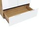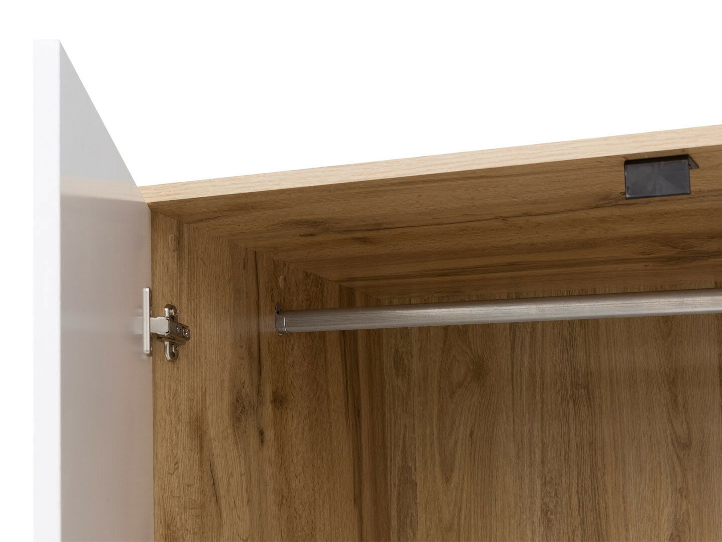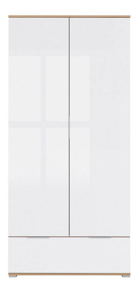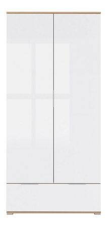 ZobrazitNajděte vašemu stylovému oblečení stylový prostor pro úschovu. Šatní skříň ve vysokém lesku v bílé barvě zepředu a dubovým korpusem zapadne do světlého pokoje. Skříň má dvoje dvířka a disponuje věšákovou tyčí na zavěšení oblečení. Do šikovné zásuvky ve spodní části skříně si umíte umístit další doplňky a prádlo. Dvířka a zásuvka mají tenčí podlouhlé úchyty.