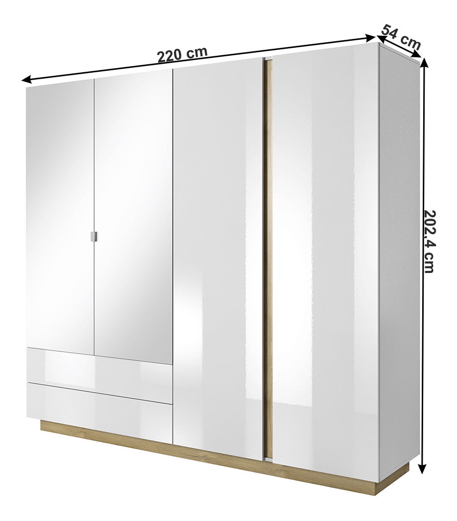 Šatní skříň Cethos (bílá + dub grandson + bílý lesk) je skvělým doplňkem pro vaši ložnici nebo šatnu. Skříň je vyrobena z kvalitních materiálů jako je DTD laminovaná s ABS hranami, které jsou odolné proti poškození. S rozměry 220x54x202,4 cm a tloušťkou materiálu 16 mm, Šatní skříň Cethos (bílá + dub grandson + bílý lesk) poskytuje dostatek místa pro vaši oblečení a doplňky. Skříň má dotykové otevírání PUSH UP, věšákovou část s věšákovou tyčí, dvě zásuvky a policovou část s policemi a se zrcadlem. Šatní skříň Cethos (bílá + dub grandson + bílý lesk) je dodávána bez LED osvětlení, ale máte možnost si dokoupit LED osvětlení. Skříň je jednoduchá pro montáž po rozložení a dodávána v demontu.