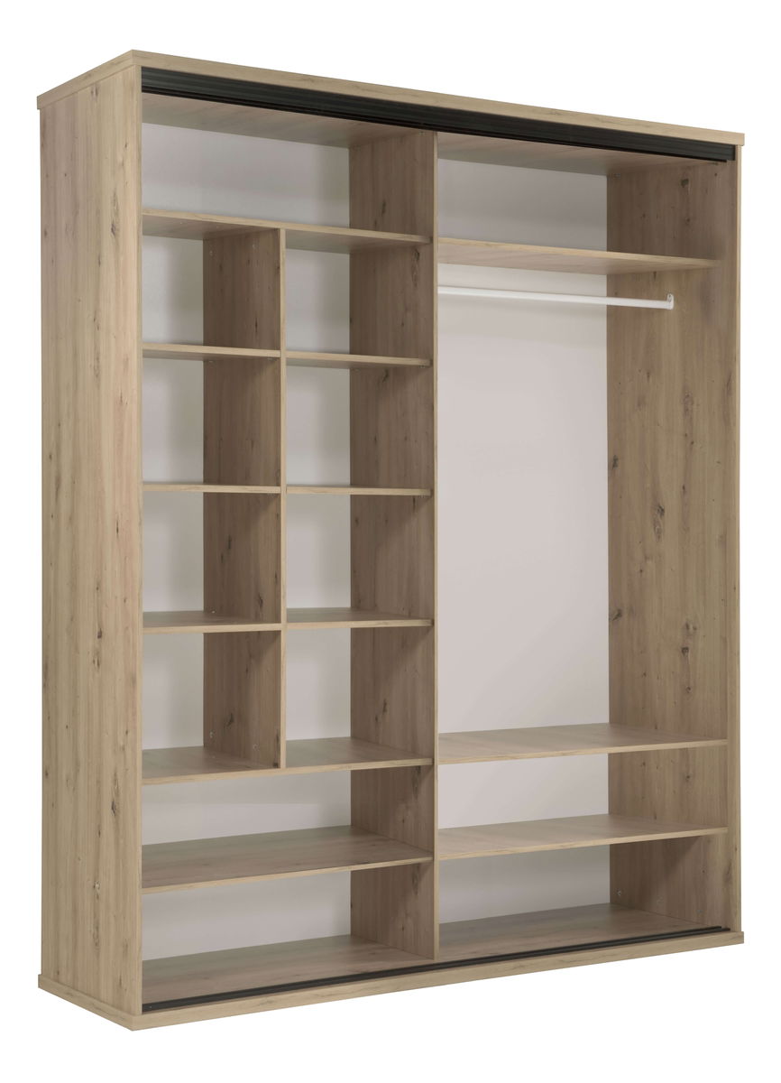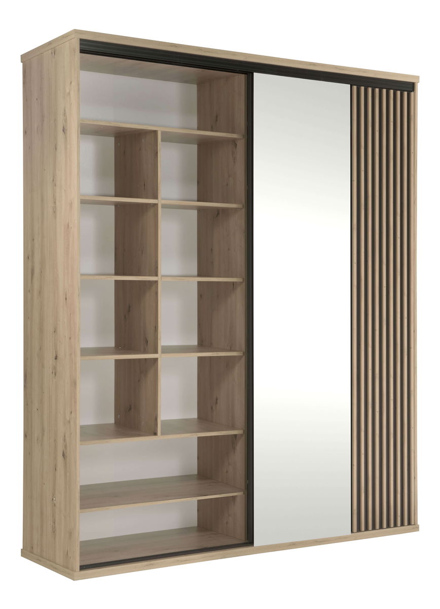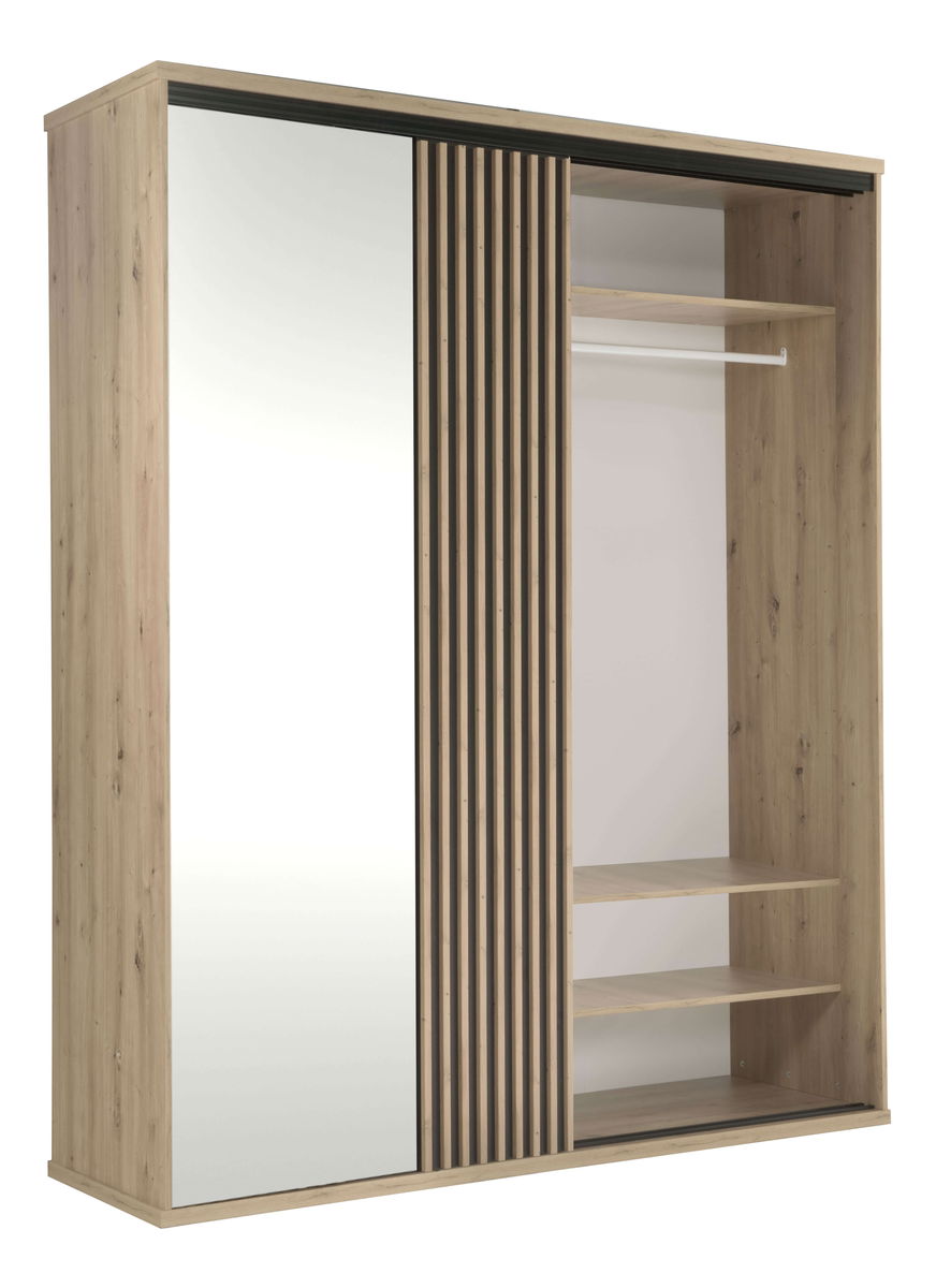 ZobrazitPokud hledáte moderní posuvnou skříň, která spojuje funkčnost s jedinečným, mírně loftovým vzhledem, máme něco právě pro vás. Harmonie a rovnováha bylo dosaženo kombinací přírodního odstínu Artisan s černými doplňky a vložkou lamel. Velké zrcadlo umístěné vpředu opticky zvětšuje prostor. Všechny masivy z kolekce Claudi spojují nejvyšší kvalitu materiálů a solidní zpracování.