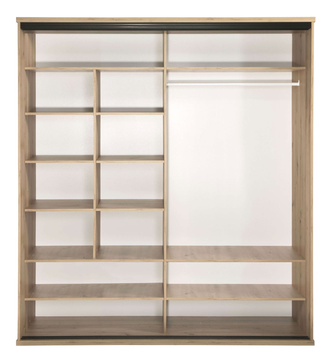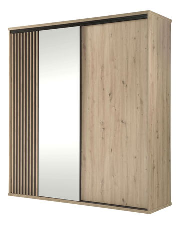 Pokud hledáte moderní posuvnou skříň, která spojuje funkčnost s jedinečným, mírně loftovým vzhledem, máme něco právě pro vás. Harmonie a rovnováha bylo dosaženo kombinací přírodního odstínu Artisan s černými doplňky a vložkou lamel. Velké zrcadlo umístěné vpředu opticky zvětšuje prostor. Všechny masivy z kolekce Claudi spojují nejvyšší kvalitu materiálů a solidní zpracování.