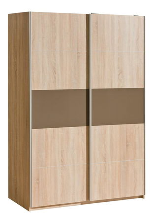 Moderní šatní skříň s posuvnými dveřmi Vám zajistí dostatečné množství úložného prostoru pro oblečení, doplňky, sportovní náčiní a jiné drobnosti. Uprostřed skříně na frontách dveří se nachází ozdobný pás. V levé části skříně se nachází věšáková tyč a v pravé části se nacházejí police.