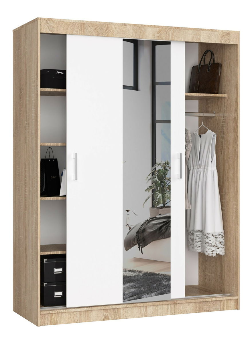 ZobrazitPředstavujeme vám šatní skříň Clotilde se zrcadlem, která jistě najde uplatnění v místnostech jako je ložnice, předsíň nebo pokoj pro mládež. Nábytek umožňuje odkládání oděvů a mnoha dalších předmětů, poskytuje prostor pro zavěšení bund, bund, košil, šatů a dlouhých kabátů, jakož i praktické police. Prezentovaný návrh v sobě spojuje elegantní, minimalistický vzhled a vysokou kvalitu, která se skládá z kvalitních materiálů a důrazu na všechny detaily. Nábytek je vybaven velkým zrcadlem, které dokáže místnost opticky zvětšit. Skříň je řešena v nadčasových přírodních barvách. Prostor pro oblečení je 85 cm. Systém pojezdu je založen na hliníkových profilech, které zajišťují vynikající vlastnosti vedení dveří a dlouhé, bezproblémové používání. Skříň s posuvnými dveřmi, která je svým vzhledem univerzální, funkční a zajišťuje dobrou organizaci oblečení, jistě splní očekávání zákazníků, kteří rádi kombinují volnost používání s trvanlivostí nábytku a odolností proti poškození. K prezentovanému návrhu si můžete libovolně vybrat další vybavení ze stejné kolekce – police, komody nebo psací stoly. Díky nim se vám jistě podaří vytvořit útulný interiér vybavený praktickým nábytkem.