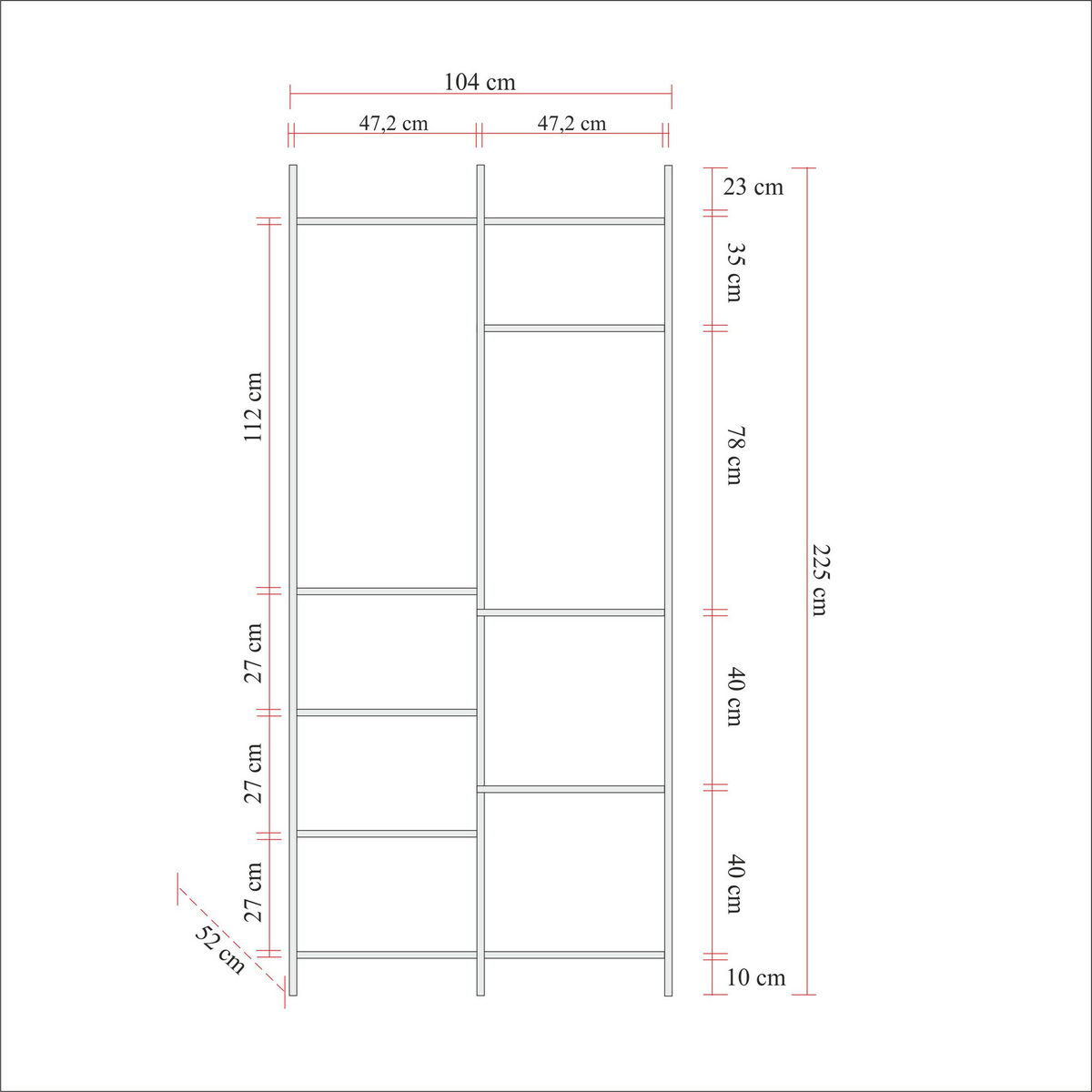 tloušťka: 18 mm, PVC lemování okrajů potřebné kovové nohy, skříň 01:00:00 šířka: 104 cm, výška: 225 cm, hloubka: 52 cm, (1 kus) skříň 02:00:00 šířka: 64 cm, výška: 225 cm, hloubka: 52 cm, (1 kus) výška police: 29,9 cm, výška zásuvky: 20 cm, výška nohy: 10 cm