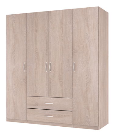 Čtyřdveřová šatní skříň s dvěma zásuvkami ve střední části.