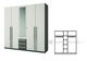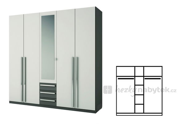 Pětidveřová šatní skříň nabízí množství úložného prostoru. Věšákové části uprostřed doplňuje policová část a tři zásuvky. Na středních dveřích se nachází zrcadlo.