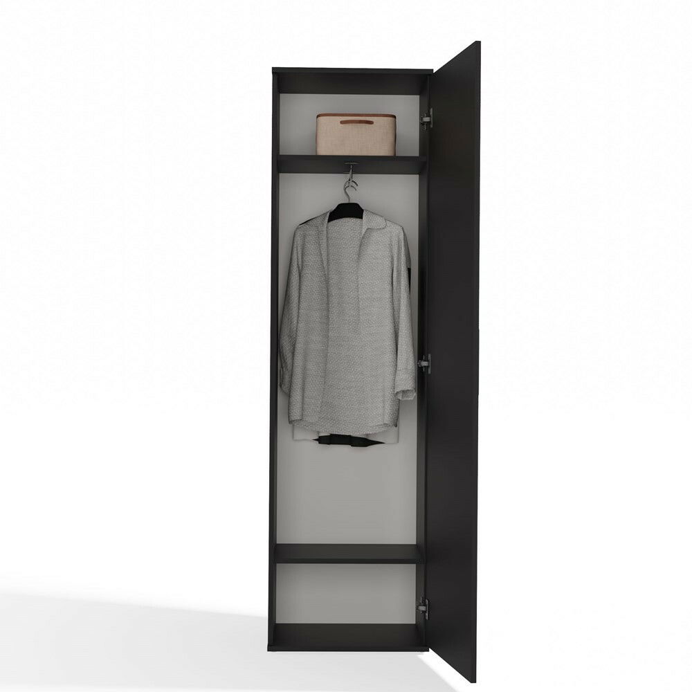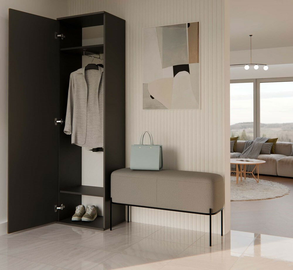 Šatní skříň Dialogos 1 v elegantní černé barvě je ideálním řešením pro moderní interiéry, kde se potýká funkčnost s estetikou. Její robustní konstrukce z laminované dřevotřísky o tloušťce 16 mm zaručuje dlouhou životnost a odolnost vůči mechanickému poškození. Vnitřní uspořádání nabízí dvě praktické poličky a úchyt na ramínka, přičemž dveře lze namontovat na levou nebo pravou stranu dle vašich potřeb. Skříň je navíc dodávána s montážním návodem, což zjednodušuje její sestavení. Tento kus nábytku přinese do vašeho domova stylový a praktický prvek.