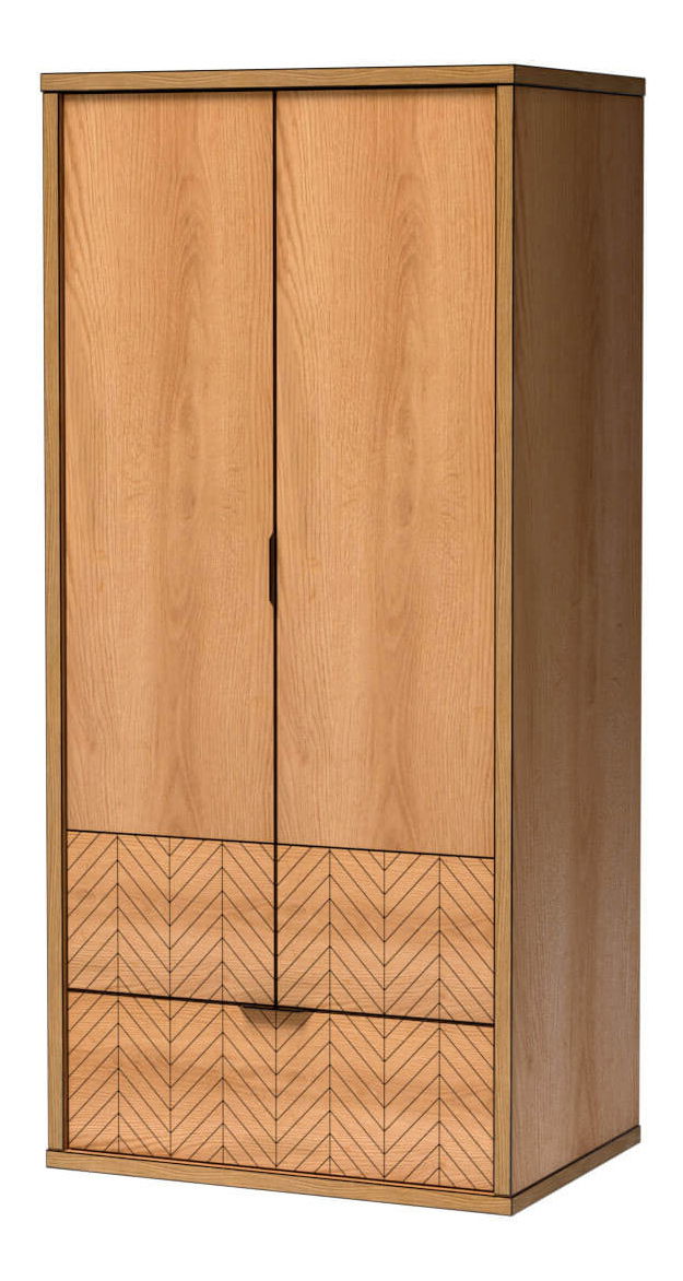 ZobrazitJednoduchá, funkční dvoudveřová šatní skříň v barvě dub karamel z kolekce Figaro. Ve spodní části naleznete velkou, prostornou zásuvku na spodní prádlo nebo drobnosti. Na pravé straně jsou police, které umožňují pohodlné uspořádání oblečení. Na levé straně v horní části naleznete polici a pod ní tyč na šaty.