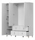 Šatní skříň - Figu (bílá) vysoká 202 cm, široká 153 cm, hluboká 55 cm. Tato šatní skříň ve skandinávském stylu je vyrobena z 16 mm silné dřevotřísky s 0,5 mm ABS hranami. Její vnější i vnitřní části jsou velmi pevné a odolné. Skříň má kožené úchyty ve tvaru poutka a dřevěné nožičky vysoké 14 cm, což dodává eleganci jejímu vzhledu. Je vybavena kuličkovým vedením, má 4 zásuvky a 3 dvířka. Na levé straně nabízí 4 poličky pro uspořádání věcí a vpravo je věšáková tyč. Tato šatní skříň je ideálním úložným řešením pro vaši ložnici, poskytuje dostatek místa pro vaše oblečení a doplňky.