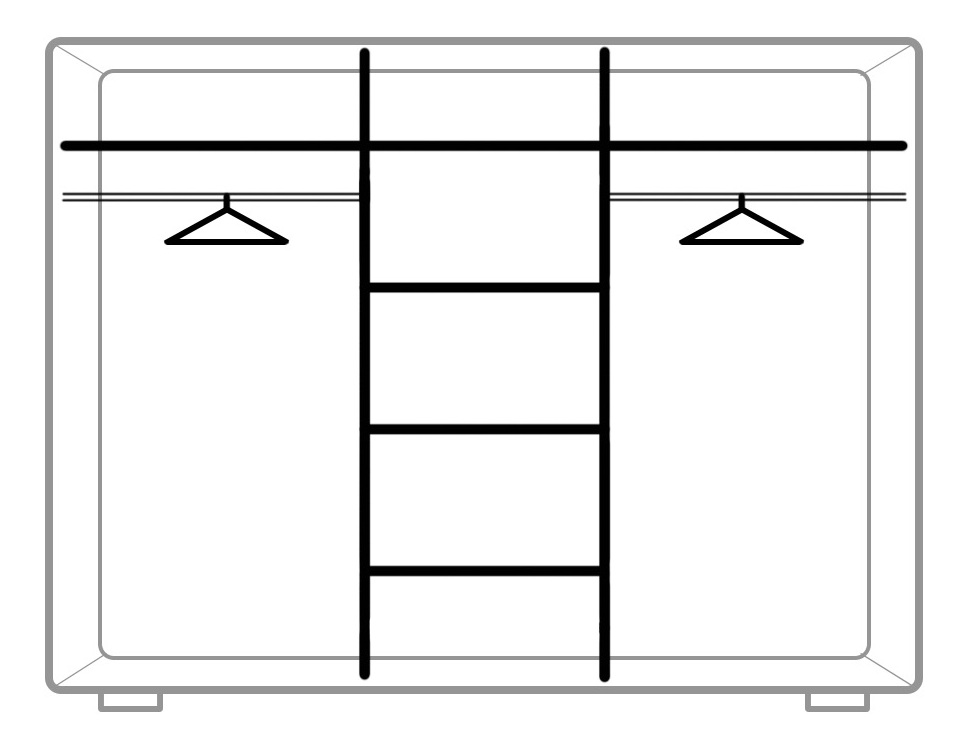 Pokud potřebujete mít pořádek ve svém oblečení, prostorná šatní skříň s množstvím úložného prostoru je ta správná volba. Třídveřová šatní skříň je rozdělena na tři části. Uprostřed se nacházejí tři poličky na uložení oblečení. Vlevo a vpravo je věšáková tyč, nad kterou je umístěna polička. Po krajích skříně jsou umístěny ozdobné lišty.
