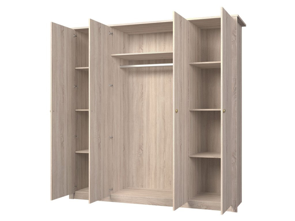 Spoustu oblečení si žádá velkou skříň. Díky této čtyřdveřové skříni pořádek v šatstvu hravě zvládnete. Za levými a pravými krajními dveřmi se nachází prostor, ve kterém jsou umístěny tři poličky. Za dvěma středními dveřmi je dlouhá věšáková tyč a nad ní umístěna police. Na krajích skříně je ozdobná lišta.