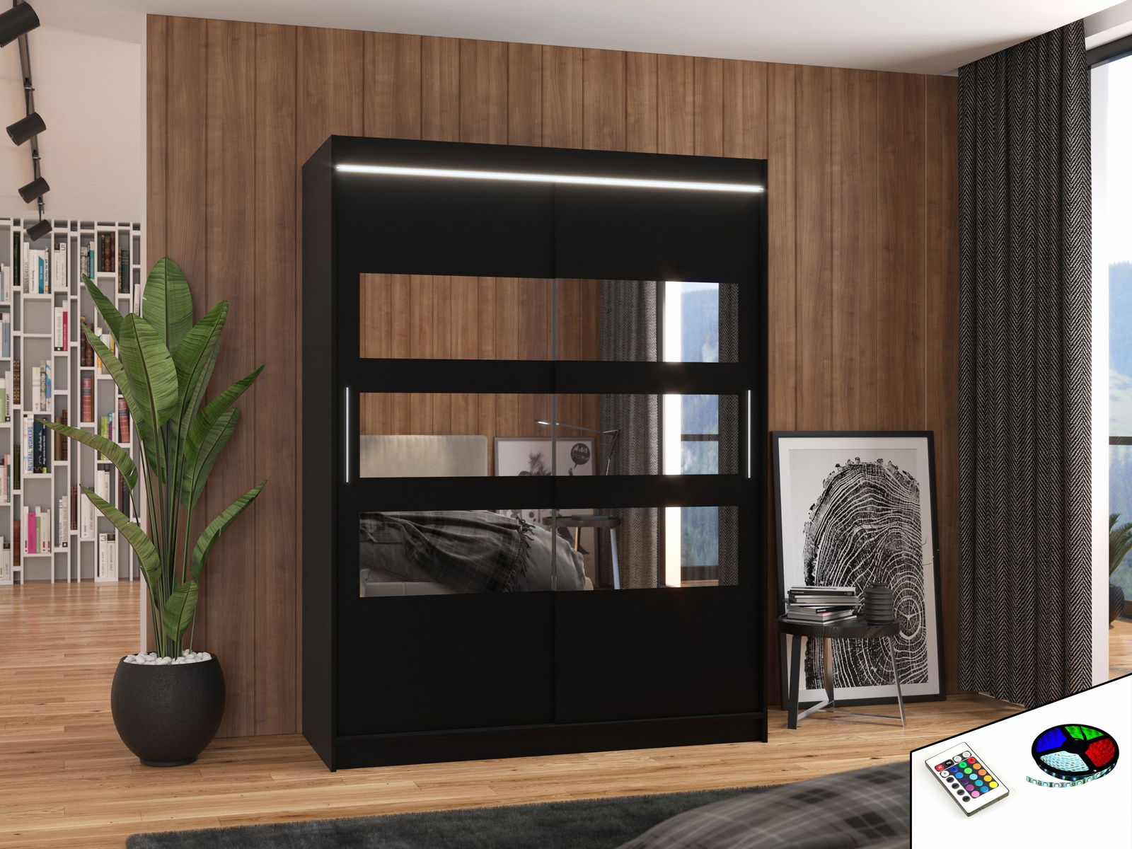 Šatní skříň Fioren (černá) (s led osvětlením) (se zrcadlem)