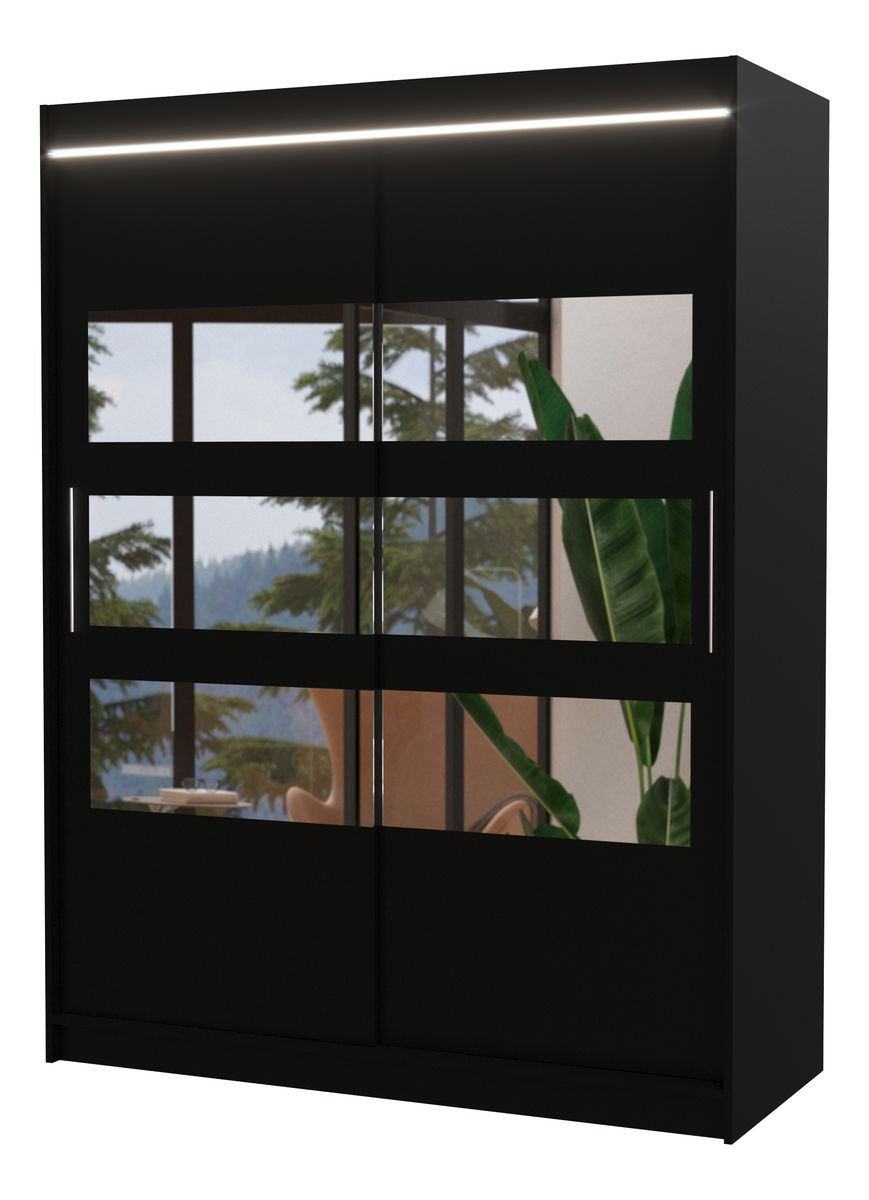 Šatní skříň Fioren v klasickém černém provedení s rozměry výška 200 cm, šířka 150 cm a hloubka 58 cm. Tato skříň je vybavena moderním LED osvětlením, které dokonale osvětluje její vnitřek. Kromě toho disponuje také velkým zrcadlem, které Vám ušetří čas a umožní rychleji sestavit dokonalý outfit pro každou příležitost. Skříň Fioren disponuje dostatkem úložného prostoru, který Vám pomůže zorganizovat Vaši šatní kolekci. Je vyrobena z kvalitních materiálů, takže můžete být jisti, že bude sloužit mnoho let. Tato šatní skříň je ideální pro ty, kteří hledají spolehlivý a stylový způsob jak uspořádat své šatní věci.