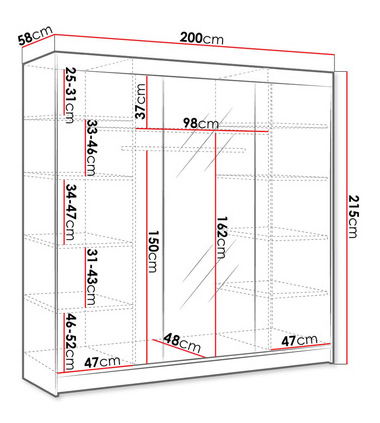 ZobrazitVelká šatní skříň s posuvnými dveřmi Galiana do obývacího pokoje, ložnice a předsíně. Vnitřek vyplněný policemi a tyčí na ramínka se skvěle hodí i jako společný šatník pro všechny členy rodiny.