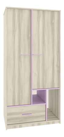 Šatní skříň s variabilními možnostmi uložení věcí. Nabízí poličky, zásuvku, věšákovou tyč a otevřené poličky.