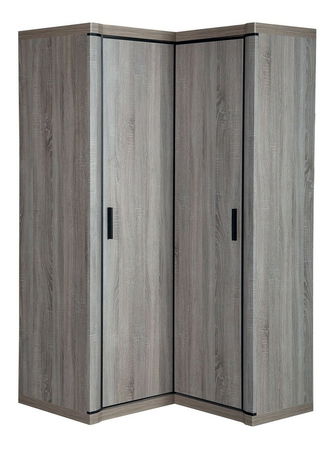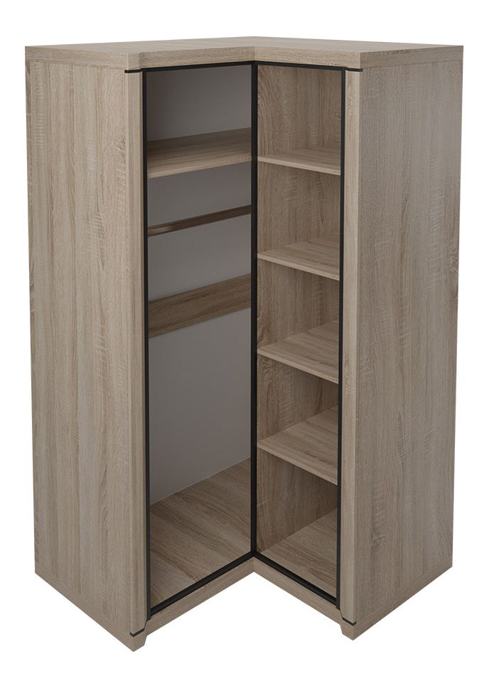 ZobrazitRohová šatní skříň je vybavena množstvím prostorných vnitřních polic a tyčí na zavěšení, která umožňuje snadné segregování oblečení. Rohová skříň je vyrobena z masivní laminované desky s barvami, které dokonale ladí s uspořádáním vašeho pokoje.