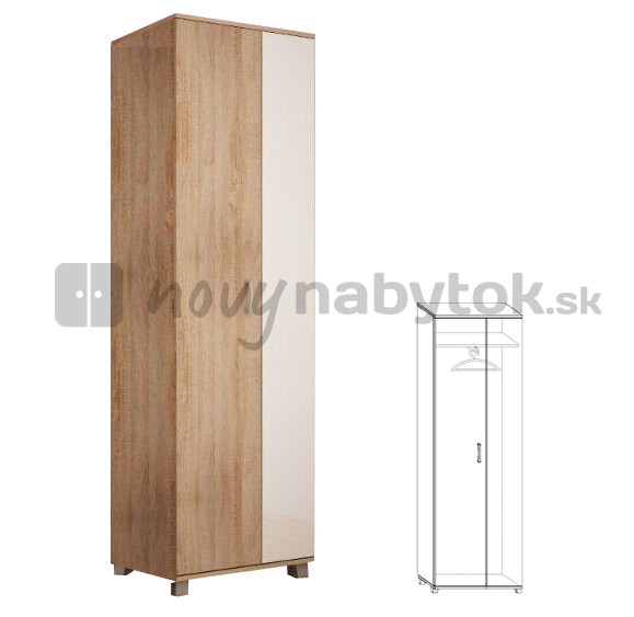 Moderní šatní skříň doplňuje předsíň z modelové řady Glady, no díky pěti barevným kombinacím se hodí také k ostatnímu nábytku nebo ji lze použít jako samostatný prvek v ložnici, předsíni nebo studentském pokoji. Úložný prostor je tvořen věšákovou tyčí nad kterou je umístěna polička. Vyobrazený produkt je v kombinaci barvy dřeva dub sonoma s bílým leskem.