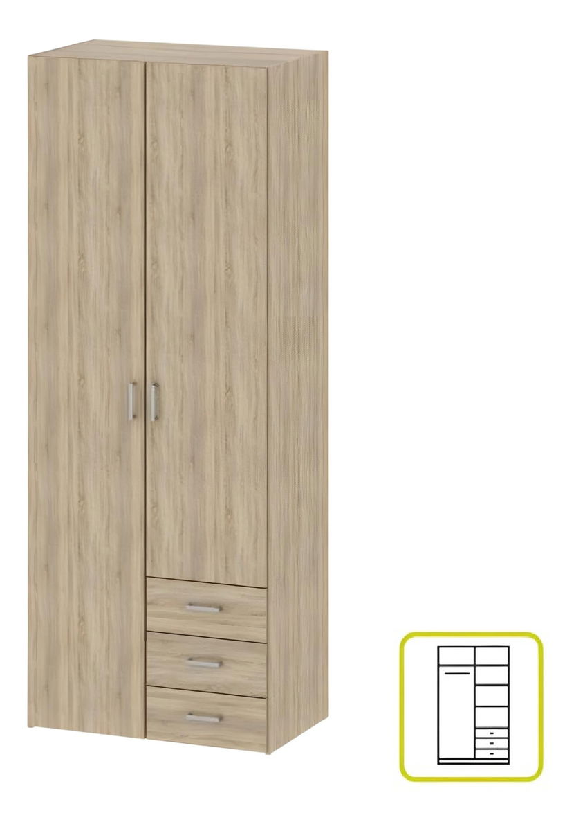 Praktická a kombinovaná šatní skříň s věšákovou policí a třemi zásuvkami je vyráběna z DTD fóliovaná materiálu. Skříň nabízí dostatek úložného prostoru, díky 3 zásuvkám, věšákové části a části s policemi. Dodáváme v demontu.