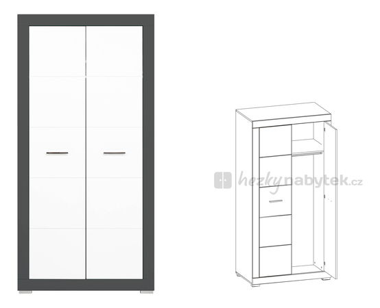 Dvoudveřová šatní skříň nabízející velký úložný prostor. V horní části se nachází polička, pod kterou je umístěna věšáková tyč.