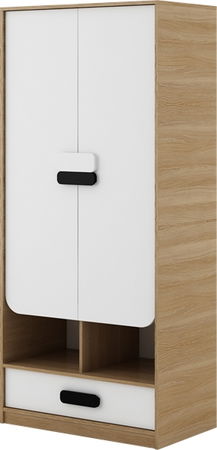 Dominantní šatní skříň schovává v hlavním prostoru věšákovou tyč, pod ní je svislou příčkou oddělen malý policový prostor a na spodku skříně se nachází mělká zásuvka.