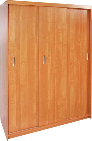 Šatní skříň s třemi posuvnými dveřmi. Uvnitř je prostor dělený na dvě části, v horní části se nachází horní polička, pod ní se nachází věšáková tyč a na spodku se nachází jedna polička. Šedé oválné úchyty, provedení olše a buk.