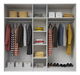 Moderní 5-dveřová šatní skříň se dělí na tři části. Po stranách je věšáková tyč kam si můžete pověsit své oblečení a pár drobností si můžete uložit na horní poličky. Ve střední části se nacházejí čtyři police, které nabízejí dostatnočný prostor pro vaše věci. Velké zrcadlové panely optický zvětší váš interier.