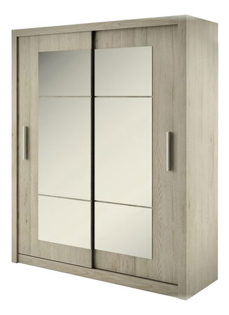 Šatní skříň s posuvnými dveřmi v moderním provedení. Korpus je vyroben z kvalitního LTD v barvě dřeva Sanremo. Dveře jsou osazeny zrcadlem. Uvnitř se kromě věšákové tyče nacházejí i poličky. Hrany na skříni jsou ohraničeny ABS páskou, která jí chrání před poškozením. Posuvné dveře jsou usazeny v hliníkových pojezdech.