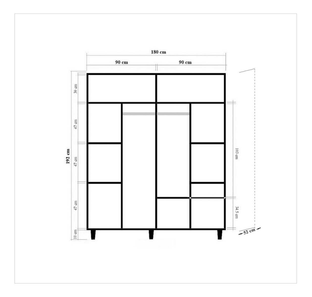 tloušťka: 18 mm, habrové nohy, kovové rukojeti, uv nátěr, šířka: 180 cm, výška: 192 cm, hloubka: 52 cm, velikost horní police: šířka: 90 cm, výška: 30 cm, výška boční police: 47 cm, výška nohou: 10 cm