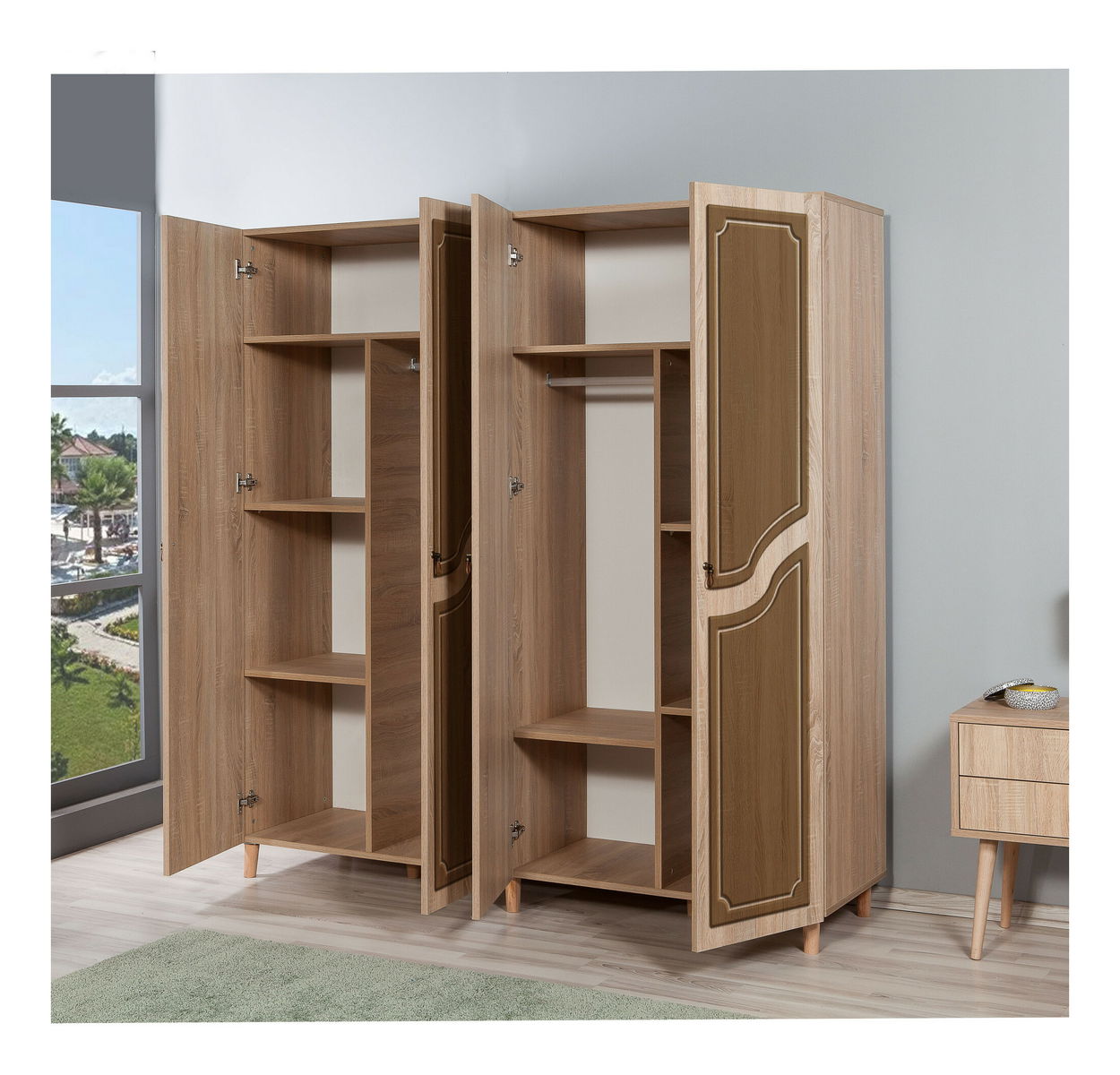 tloušťka: 18 mm, habrové nohy, kovové rukojeti, uv nátěr, šířka: 180 cm, výška: 192 cm, hloubka: 52 cm, velikost horní police: šířka: 90 cm, výška: 30 cm, výška boční police: 47 cm, výška nohou: 10 cm