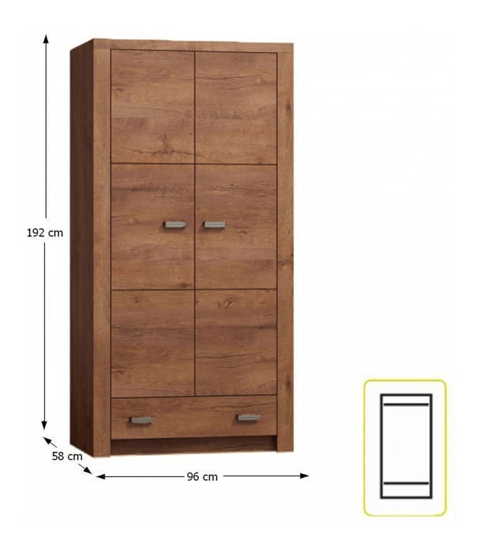 Kvalitní šatní skříň Inneas je pěknou a praktickou ozdobou obývacích pokojů a ložnic. Ve spodní části skříně se nachází jedna zásuvka a ve vrchní části věšáková tyč a nad ní jedna praktická polička. Skříň je v barvě jasan světlý a je dodávána v demontu.